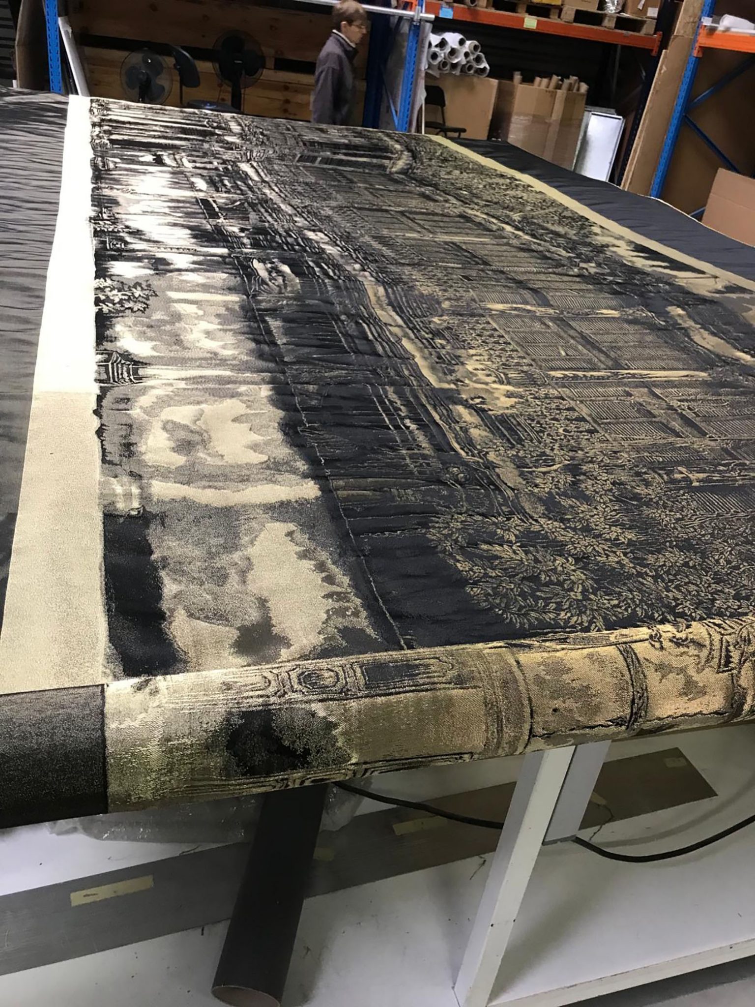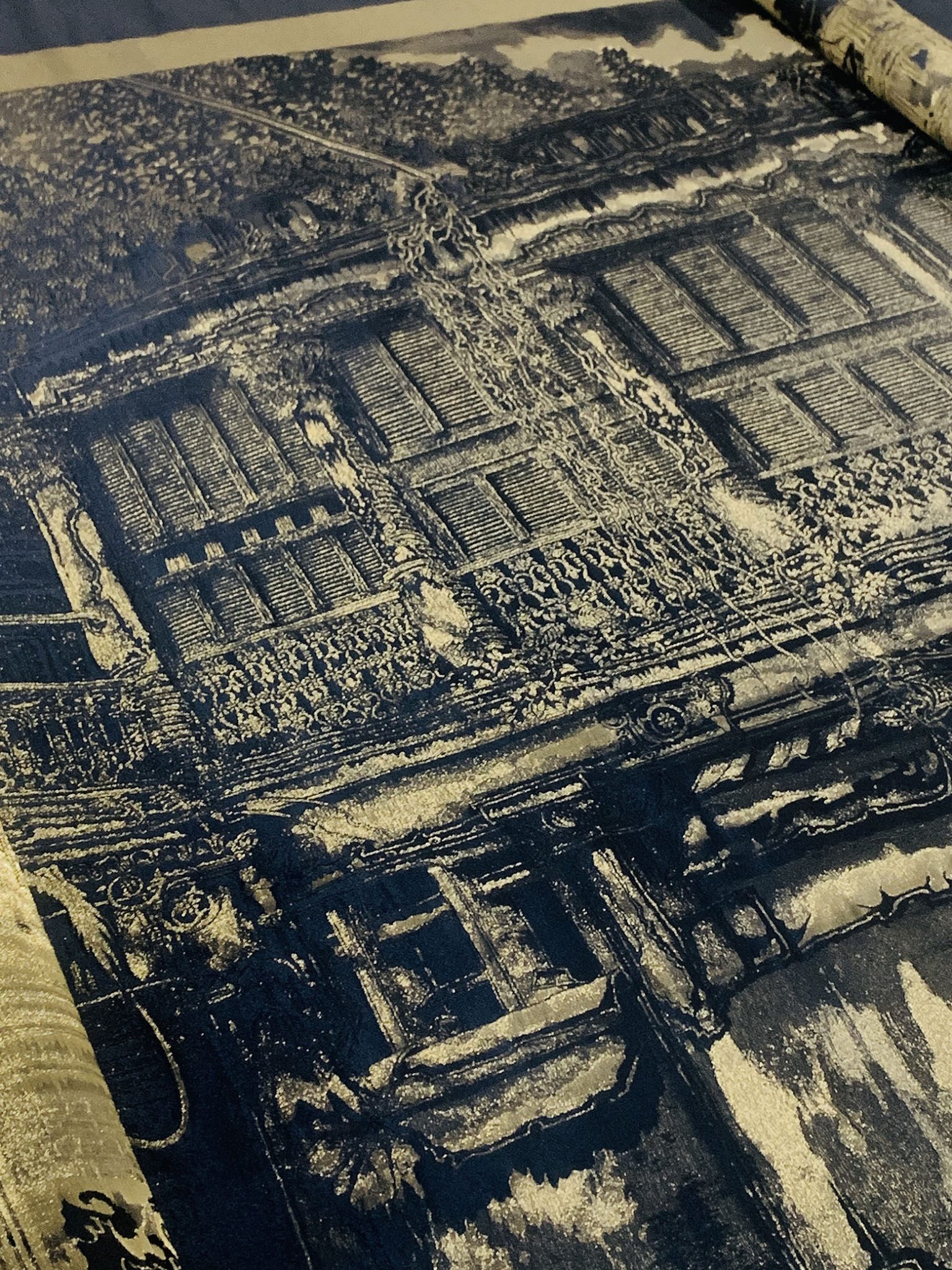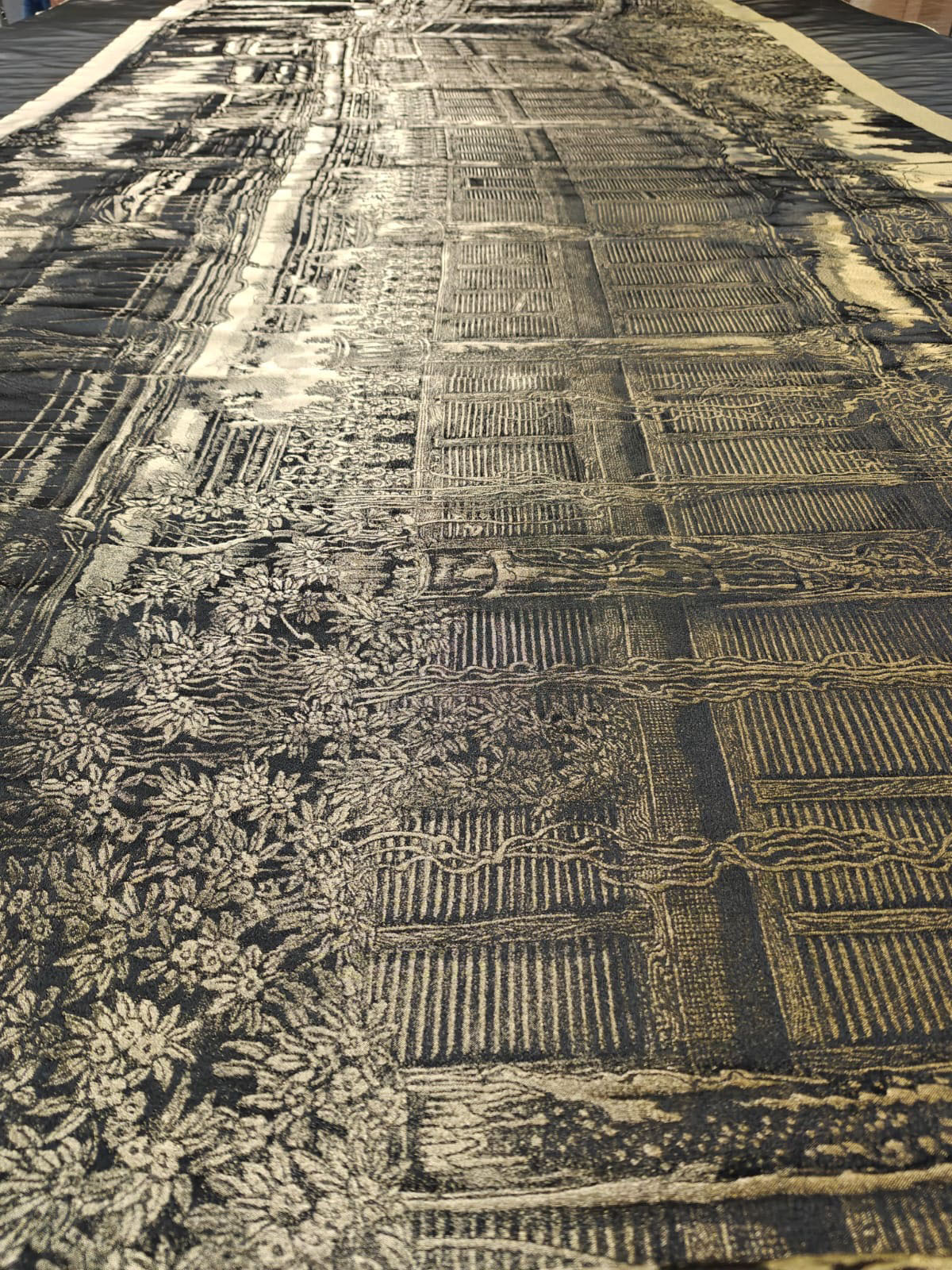 High-resolution digitization of the original ink drawing. Transmission of the files to the Brochier workshops in Villeurbanne, France, where the work is woven on a state-of-the-art loom, intertwining thousands of polyester and gold threads.